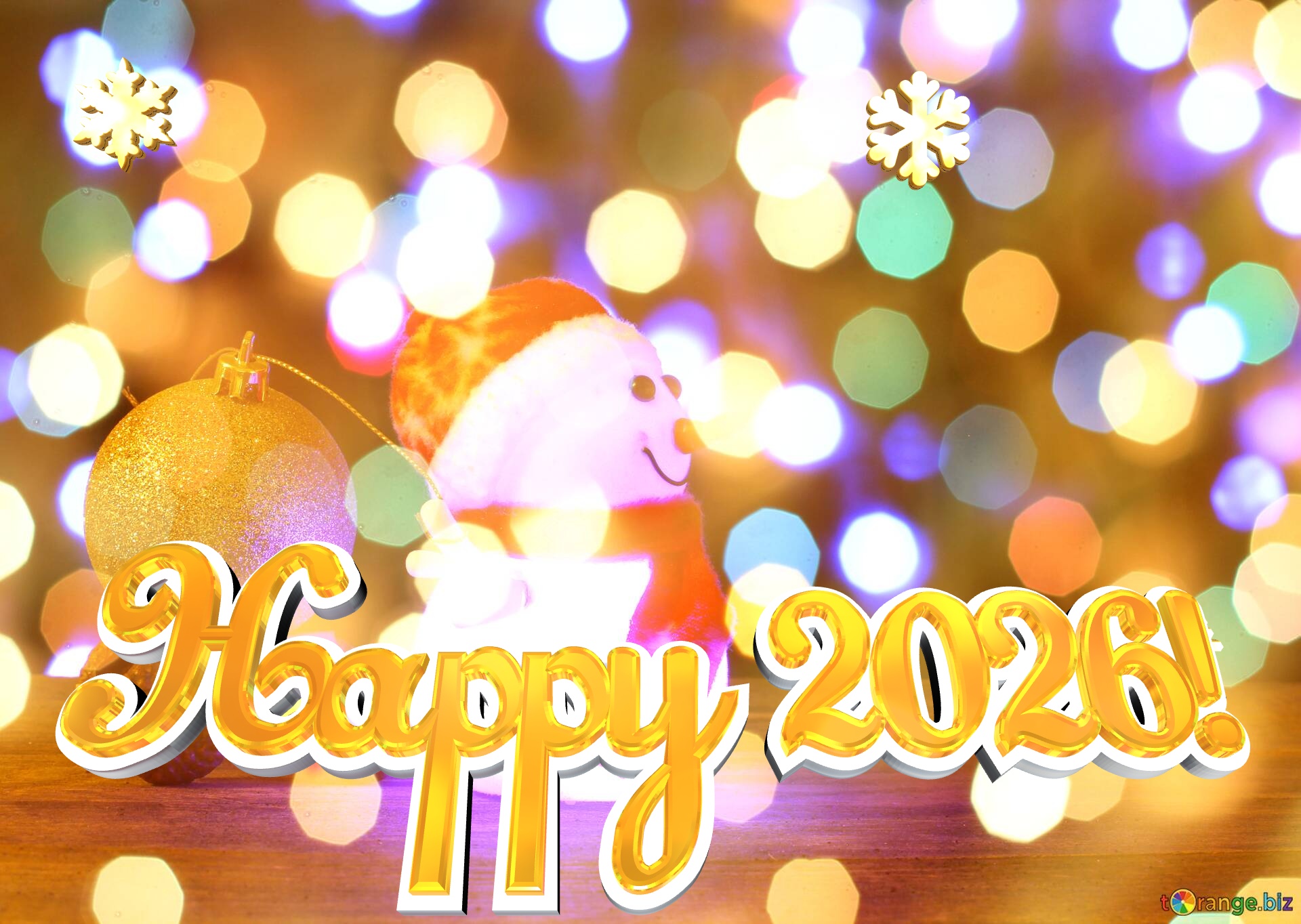 Volumetric 3D inscription Happy 2026! oVolumetric 3D inscription Charming Christmas Snowman Amidst Glittering Holiday Lights