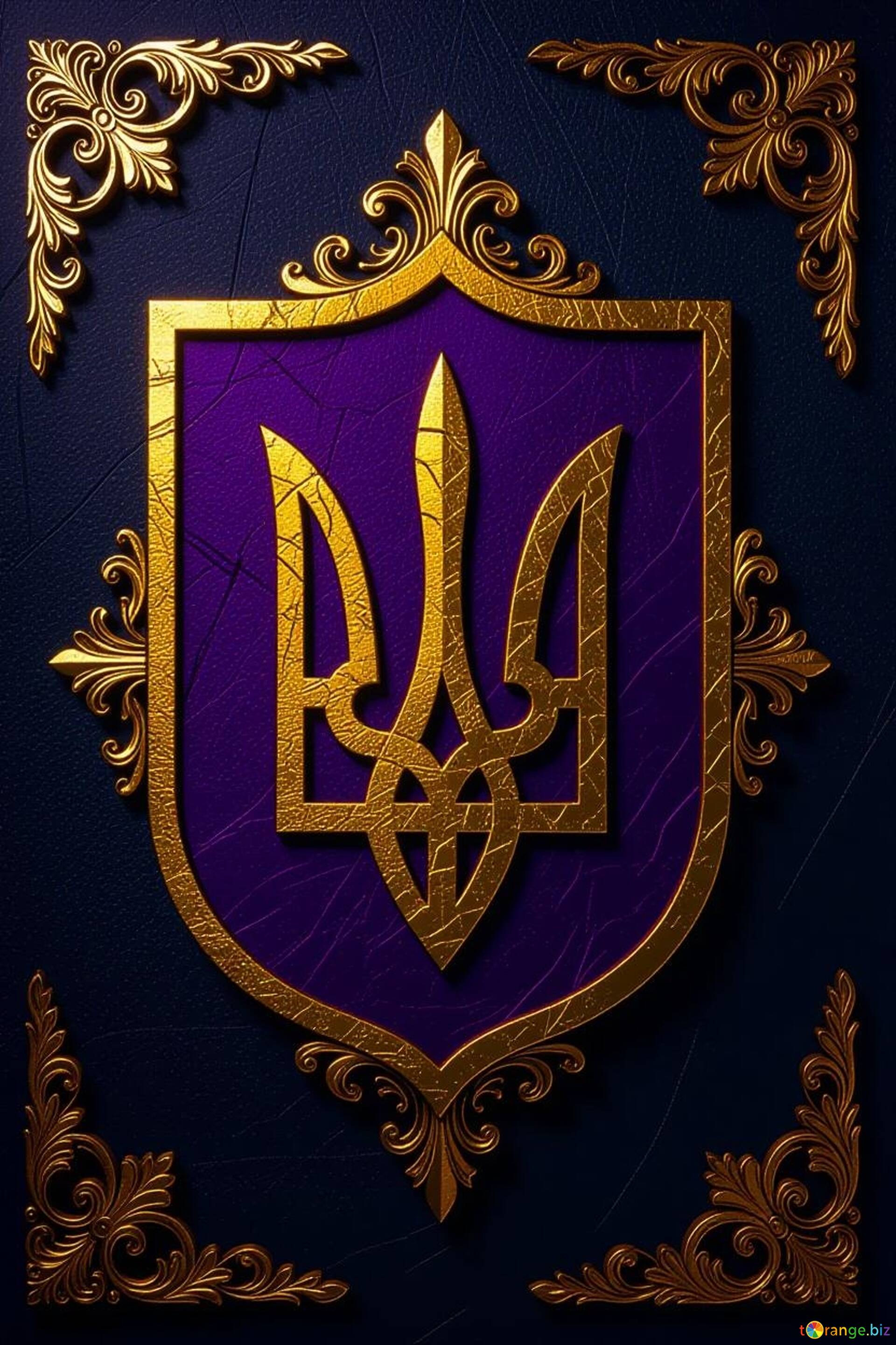Elegante emblema tridente ucraniano dorado y morado con marco ornamentado Foto disponible en los discos:Fondos de Ucrania , Generado por IA , Nuevas fotos , imágenes gratuitas