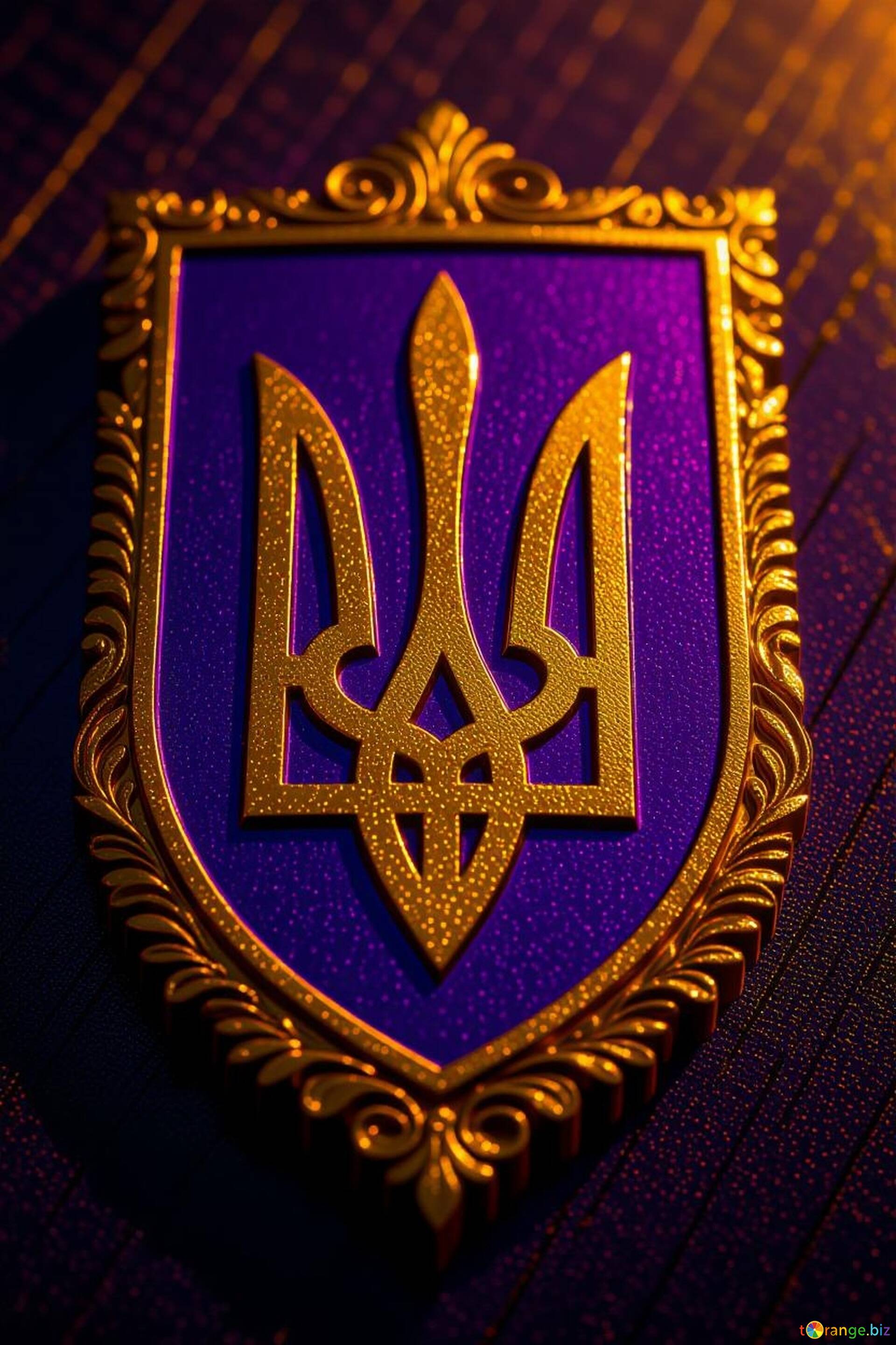 In this captivating image, a striking gold emblem features the Ukrainian trident, intricately designed on a luxurious purple backdrop. The shield exudes opulence with ornate detailing and a shimmering texture that captures the light, creating an atmospheric glow. Imagined in a dreamlike setting, the emblem symbolizes strength and heritage, standing out against a rich fabric that echoes tradition. The interplay of light and shadow accentuates the emblem's curves and edges, inviting viewers to immerse themselves in its regal beauty and the cultural significance it harbors.