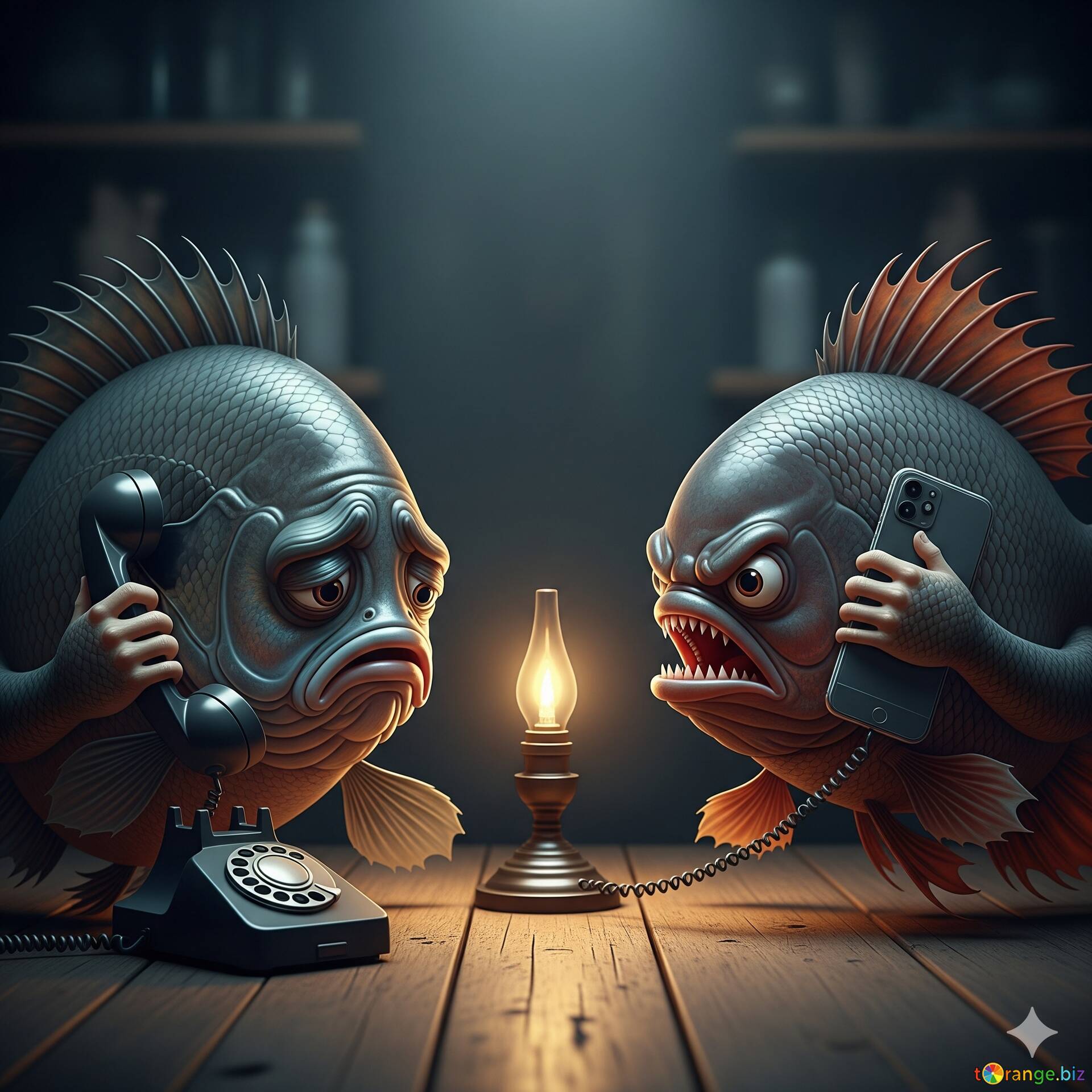 Due pesci da cartone animato impegnati in un'accesa conversazione telefonica sotto una lanterna Foto disponibile negli album:Generato dall'intelligenza artificiale , Nuove foto , immagini gratuite