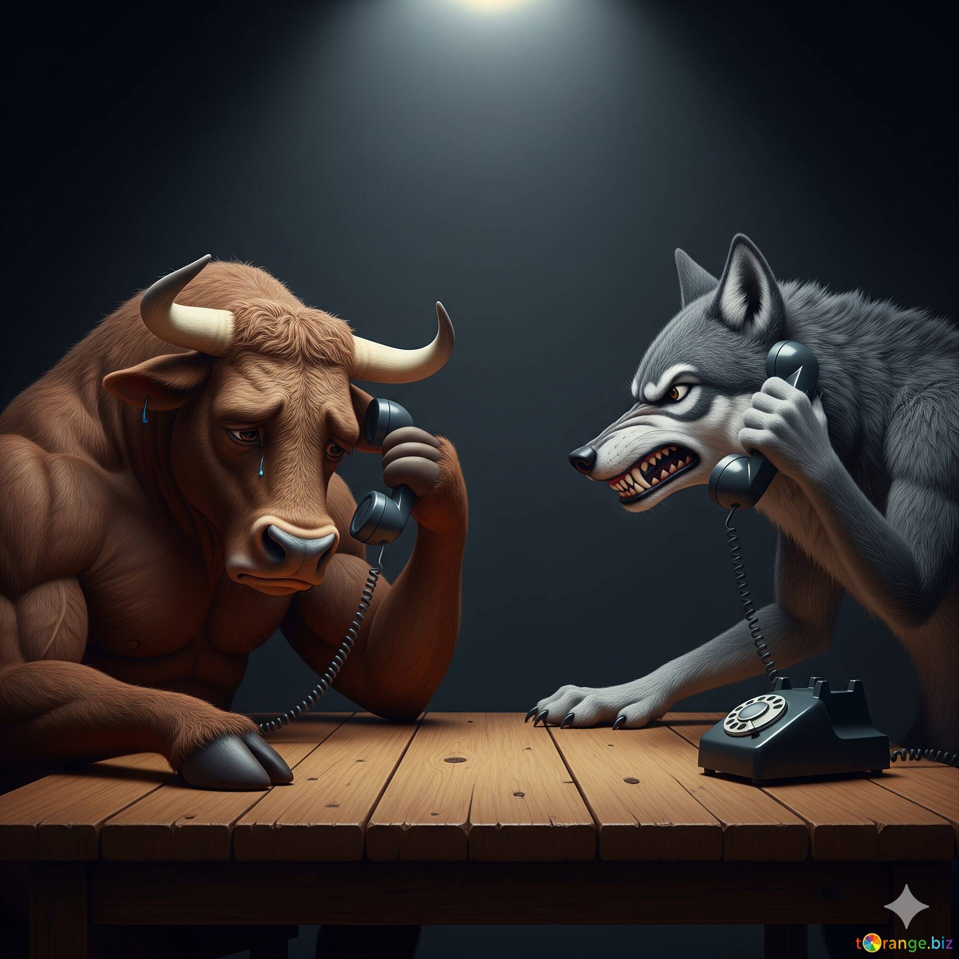 雄牛とオオカミの感情的な通話 - 携帯電話を使った動物アート アルバムで利用できる写真:AI生成 , 新しい写真 , 無料の写真